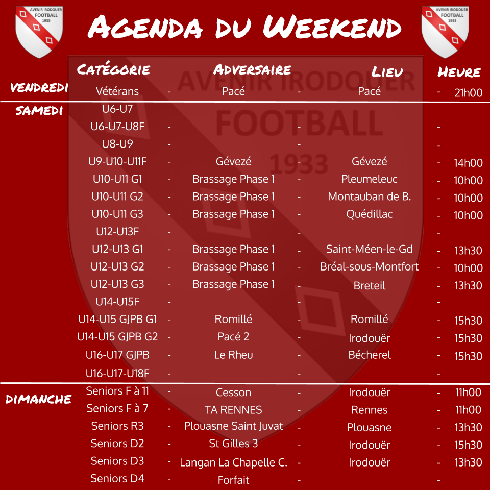 L'agenda vous donne les principales informations sur les rencontres du weekend pour chacune des catégories du club (adversaire, lieu, date).